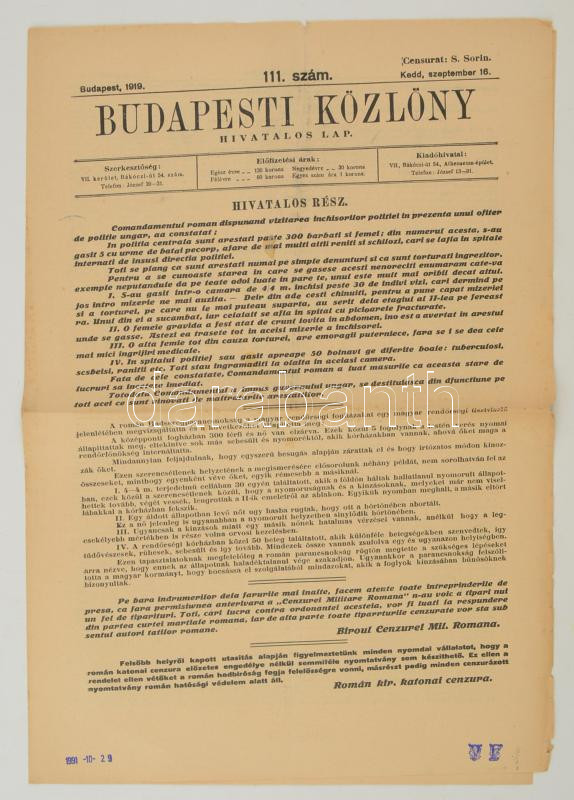 1919 Budapesti Közlöny, 1919. szeptember 16., 111. szám, benne a megsz... https://www.darabanth.com/de/283-Fernauktion/283.0/Andere-Sammelgebiete/Drucksachen~28/1919-Budapesti-Kozlony-1919-szeptember-16-111-szam-benne-a-megszallo-roman-parancsnoksa~II1466028