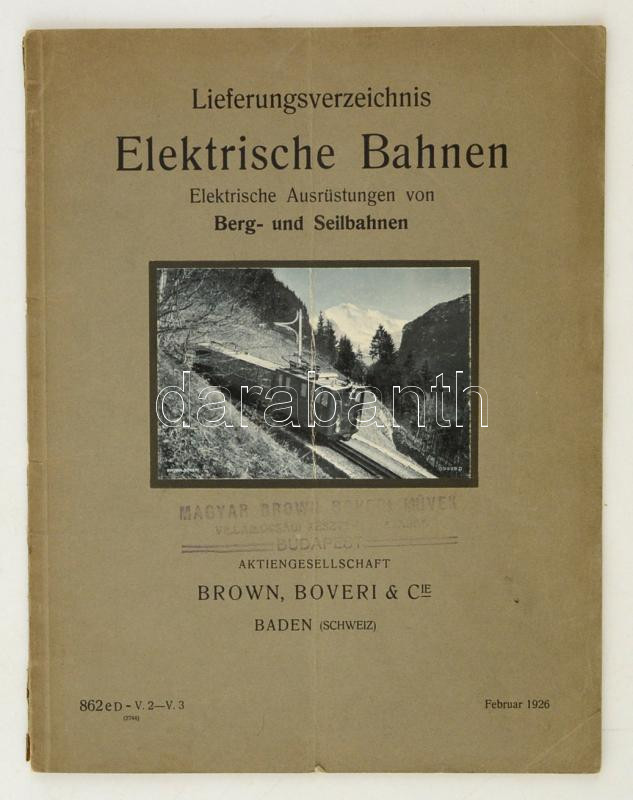 Beschreibung: 1926 Lieferungsverzeichnis Elektrische Bahnen, Elektrische Ausrüstungen von Berg- und Seilbahnen, Aktiengesellschaft Brown, Boveri& Cie Schweiz, képekkel illusztrált, 39p