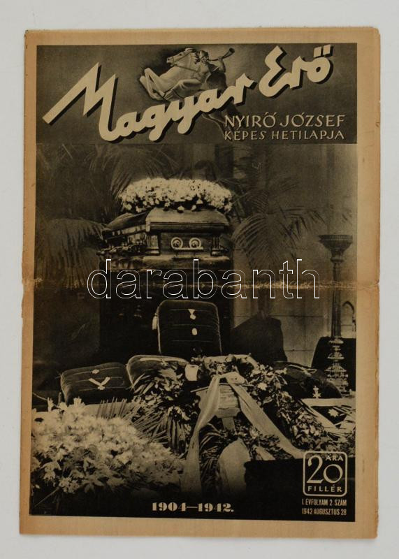 1942 Magyar Erő. Nyirő József képes hetilapja, vitéz nagybányai Horthy István (1904-1942) kormányzóhelyettes temetésének szentelt szám, szakadozott állapotban.