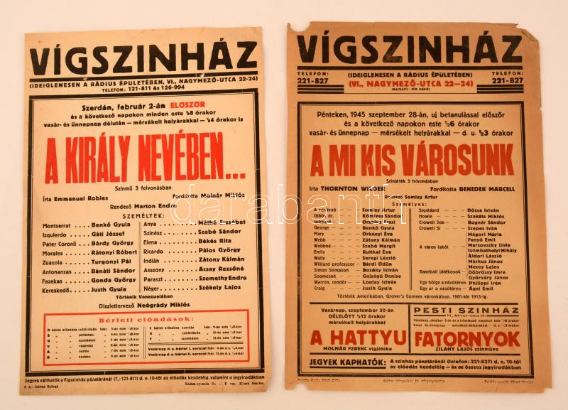 Beschreibung: 1945 2 db Vígszínházi plakát (a Rádius épületében játszó színházzal) 30x44 cm