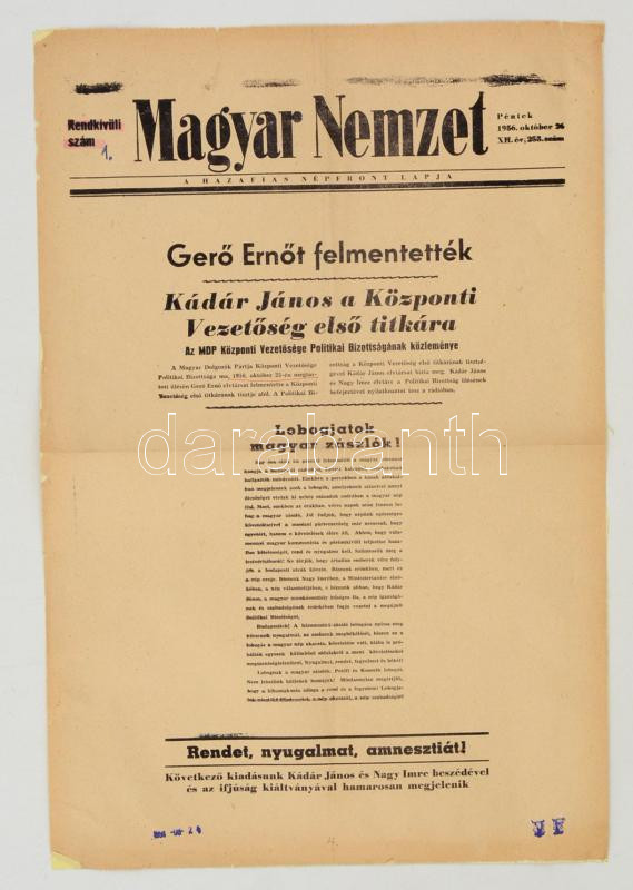 1956 A Magyar Nemzet 1956. október 26. Rendkívüli 1. szám, Gerő Ernő felmentéséről, Kádár János a Központi Vezetőség első titkárrá választásáról, színes kiemelésekkel, a hátoldalon ragasztással megerősítve.