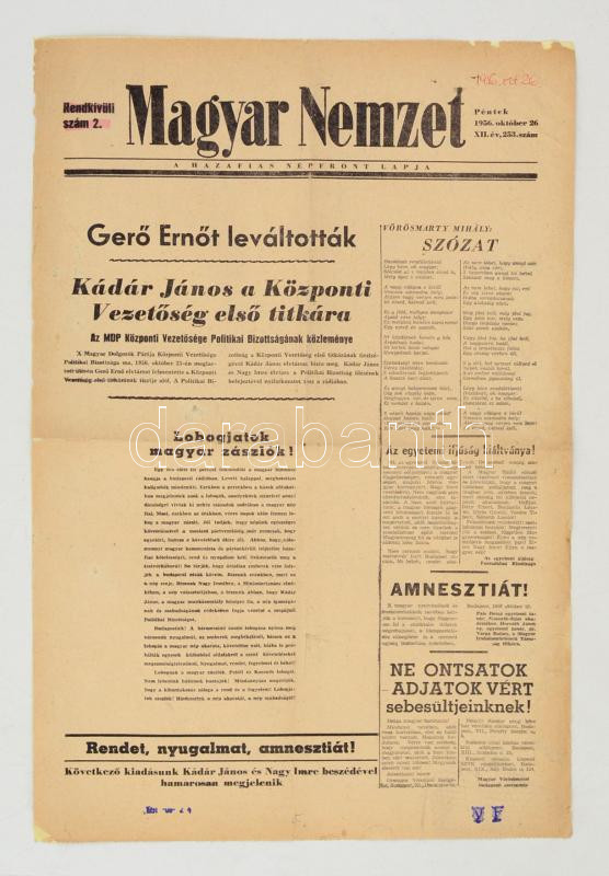 1956 A Magyar Nemzet 1956. október 26. Rendkívüli 2. szám, Gerő Ernő felmentéséről, Kádár János a Központi Vezetőség első titkárrá választásáról, színes kiemelésekkel, a hátoldalon ragasztással megerősítve.