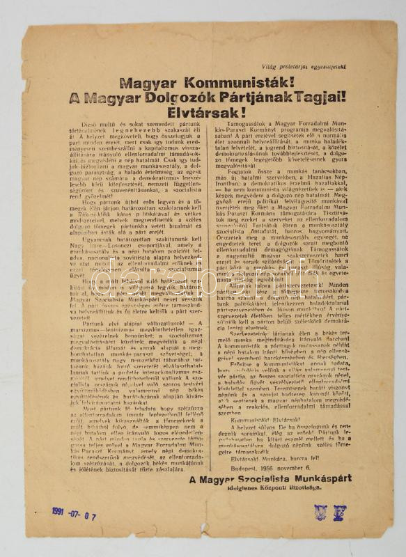 1956 A Magyar Szocialista Munkáspárt ideiglenes Központi Bizottságának felhívása, röplap, 1956. november 6., kissé foltos, kissé szakadozott szélekkel, 31x22 cm.