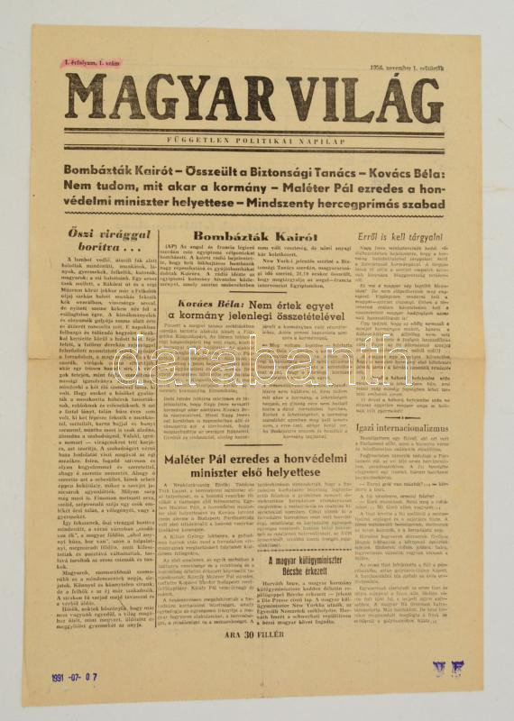 1956 Magyar Világ. 1956. november 1., I. évfolyam, 1. szám, 1 l., benn... https://www.darabanth.com/de/283-Fernauktion/283.0/Andere-Sammelgebiete/Drucksachen~28/1956-Magyar-Vilag-1956-november-1-I-evfolyam-1-szam-1-l-benne-a-forradalom-hireivel-J~II1466315
