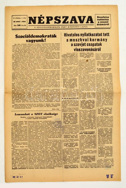 1956 Népszava. Szociáldemokrata Párt központi lapja, 1956. november 1., 77. évfolyam 1. szám. Népszava eredetileg a Szociáldemokrata Párt lapja volt. 1948. június 12.-én a Szociáldemokrata Párt egyesült a Magyar Komunista Párttal, és létrehozták a Magyar Dolgozók Pártját. A Népszava ekkor a szakszervezetekhez került. 1956-ban a Szociáldemokrata Párt egy rövid ídőre újjá alakult, és visszavették a lapot. Ez ennek a visszaszerzett lapnak a 77. évfolyamának az 1. száma.