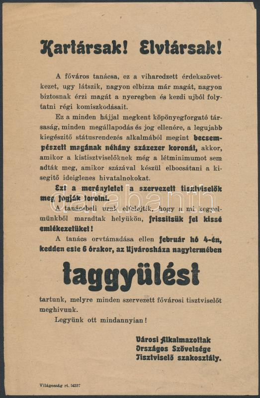 Beschreibung: cca 1920-1925 A városi Alkalmazottak Országos Szövetsége Tisztviselői Szakosztályának taggyűlését népszerűsítő szórólap