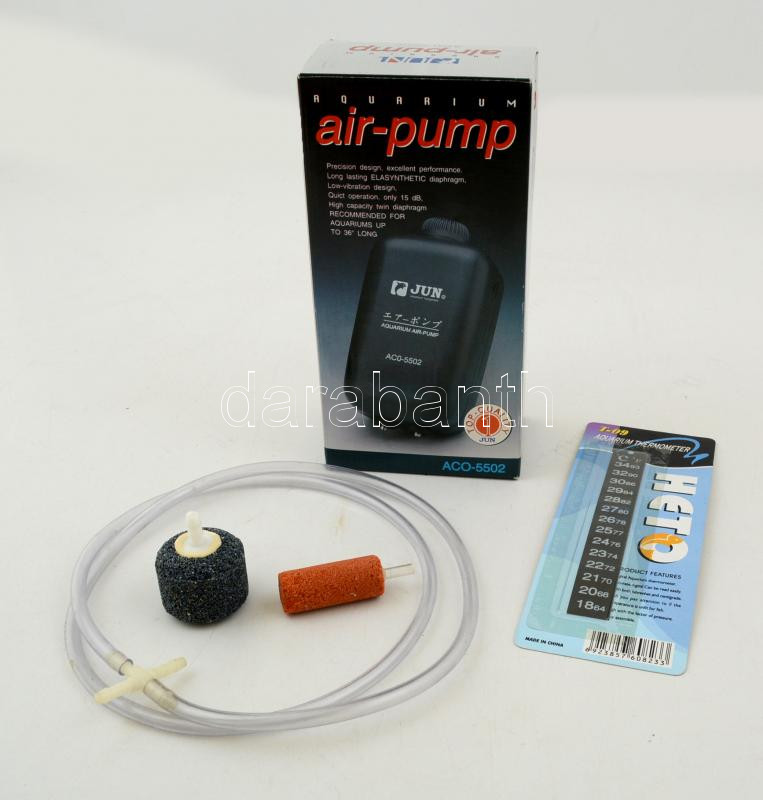 Beschreibung: Akvárium kellék tétel: oxigénpuma hőmérővel, 2 db porlasztó