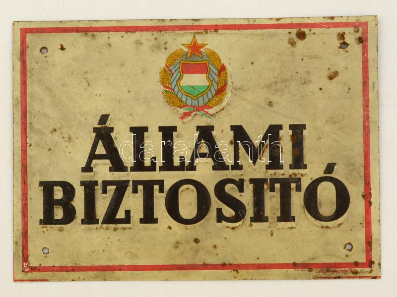 "Állami Biztosító" feliratú zománcozott fémtábla, kopásnyomokkal, 10,5... https://www.darabanth.com/de/283-Fernauktion/283.0/Andere-Sammelgebiete/Flohmarkt~12/Allami-Biztosito-feliratu-zomancozott-femtabla-kopasnyomokkal-10-5C39715-cm~II1467937
