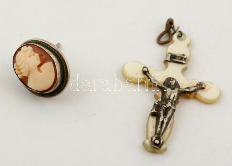 Beschreibung: Antik cameos fülbevaló (egy db) és egy gyöngyházás feszület medál