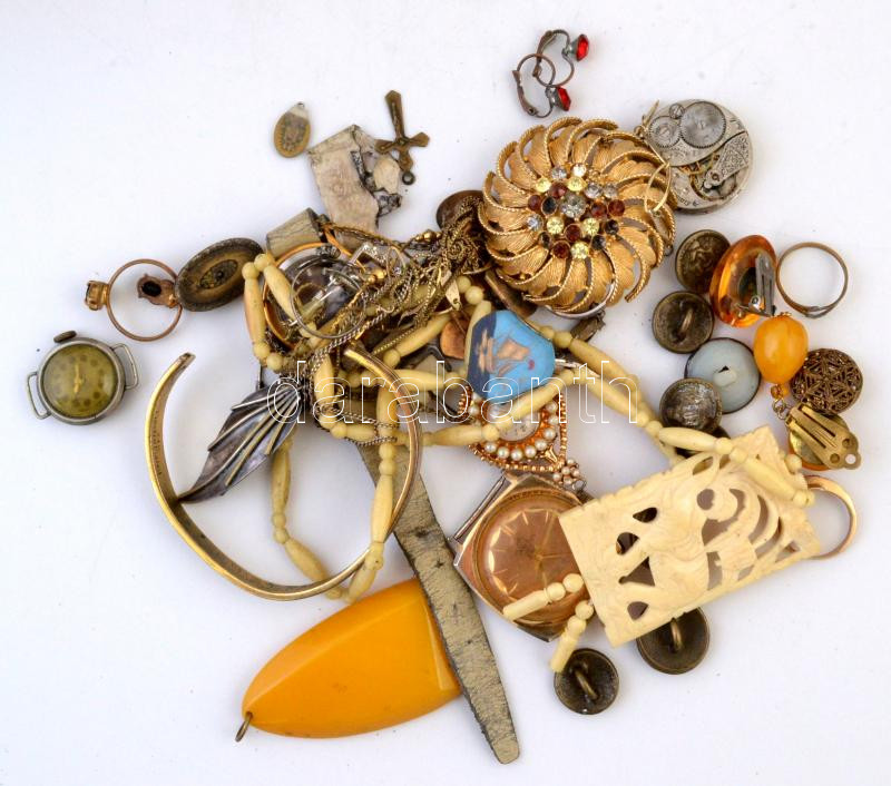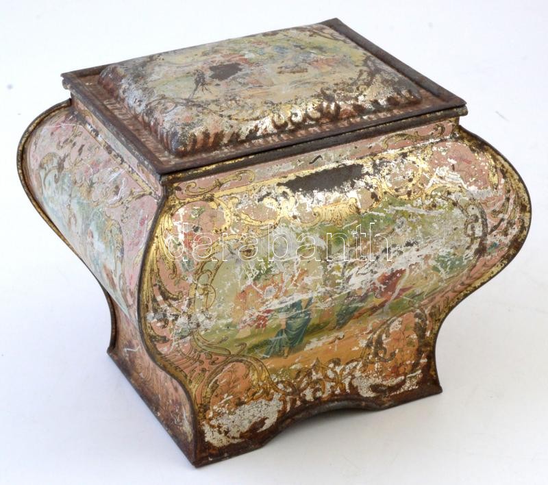 Beschreibung: Festett, díszes bádogdoboz, benne órákkal, ékszerekkel
