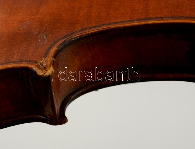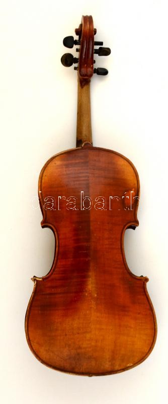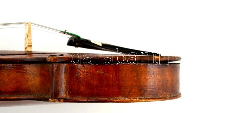 Beschreibung: Hegedű, műbőr tokban, vonóval, hegedű húrral, a hegedű sérült, kopottas, a műbőr két helyen elvált a toktól,