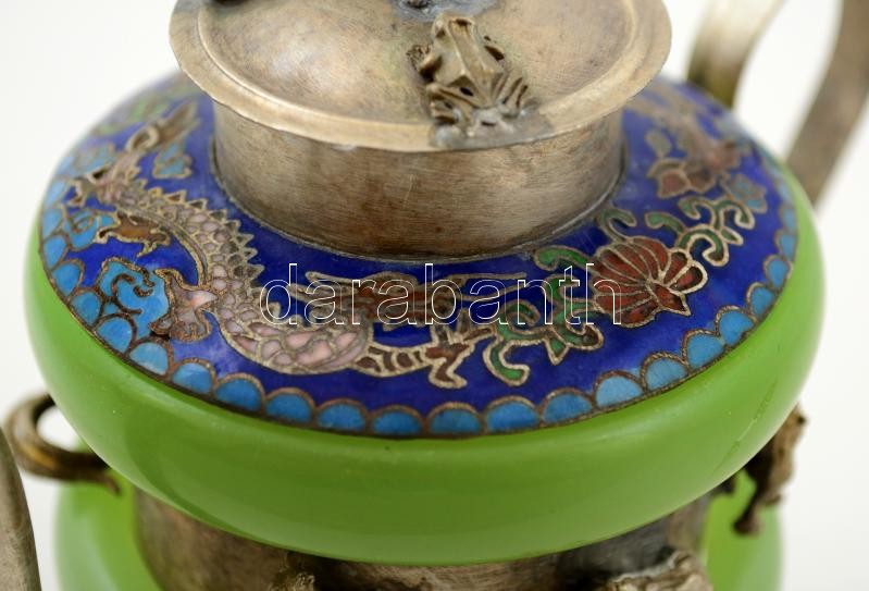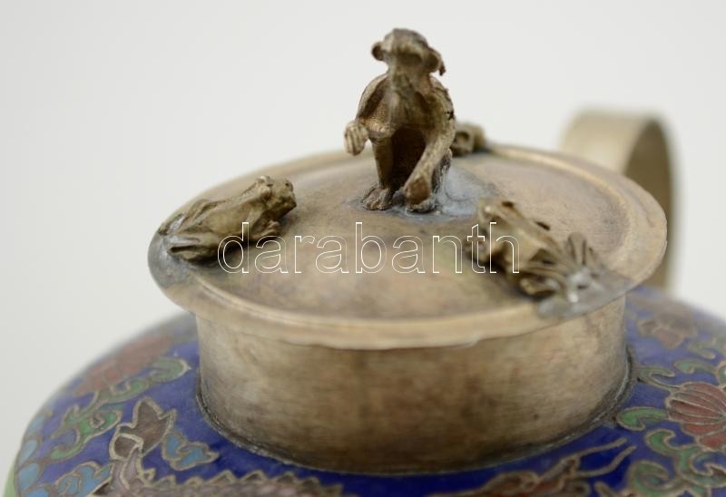 Beschreibung: Jádéval és rekeszzománccal díszített fém teáskanna, tetején apró majomfigurával, m: 12 cm