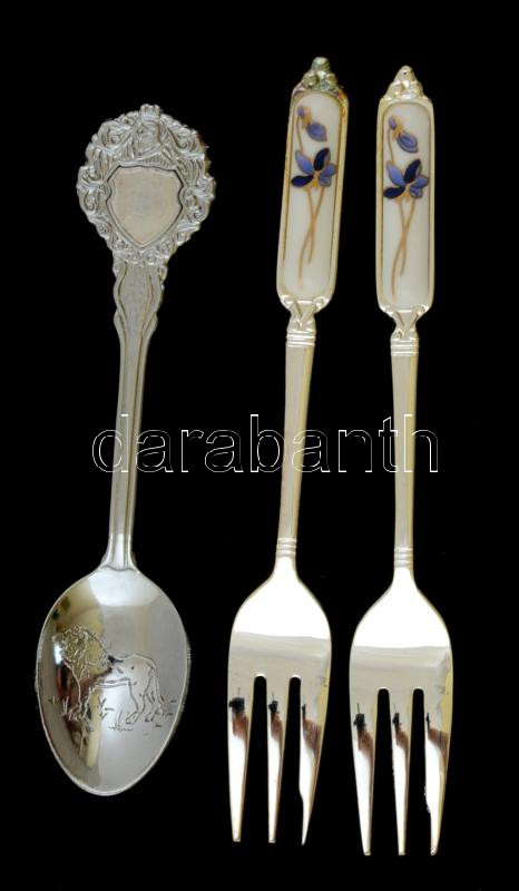 Beschreibung: Koreai porcelánnal díszített szárú tortavilla, 2 db, h: 13 cm + oroszlános díszkanál, h: 11,5 cm, szép állapotban, összesen 3 db