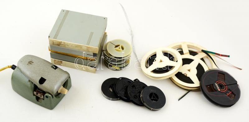 Beschreibung: Meopta magnószalag vágó készülék, hozzá 7 magnószalaggal, és tokkal