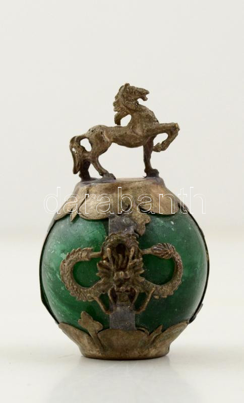 Beschreibung: Nagyméretű jáde kő lovas fém foglalatban, m: 5,5 cm