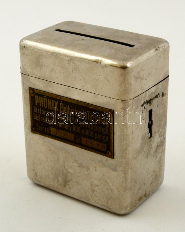 "Phőnix Életbiztosító Társaság" persely kulcs nélkül, 10x5,5x8,5 cm https://www.darabanth.com/de/283-Fernauktion/283.0/Andere-Sammelgebiete/Flohmarkt~12/Phonix-Eletbiztosito-Tarsasag-persely-kulcs-nelkul-10x5-5x8-5-cm~II1465387
