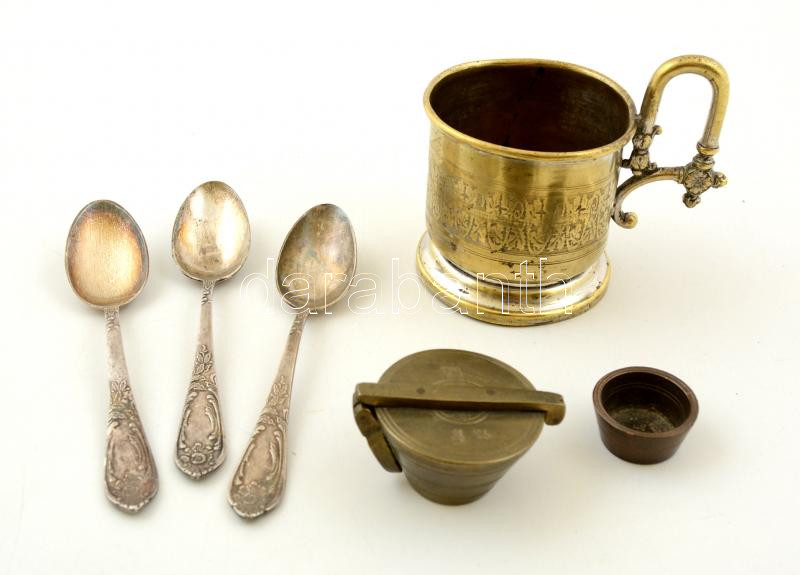Beschreibung: Régi fém tétel: Latmérő készlet egy hiányzik, dekoratív aranyozott csésze, 3 db szovjet ezüstözött kiskanál, összesen:6 db