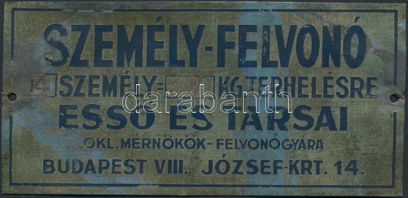 "Személy-felvonó Esső és Társai" fém tábla, 7x15 cm https://www.darabanth.com/de/283-Fernauktion/283.0/Andere-Sammelgebiete/Flohmarkt~12/Szemely-felvono-Esso-es-Tarsai-fem-tabla-7x15-cm~II1465208