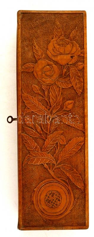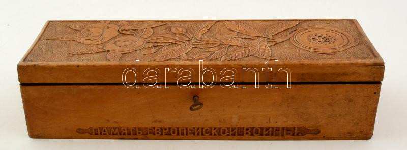 cca 1914-1945 Virágmintákkal, és végtelen fonnattal díszített fa doboz, orosz felirattal, a fedő belseje firkált, az egyik vége szúette, kissé laza fedéllel, 8x33x10 cm.