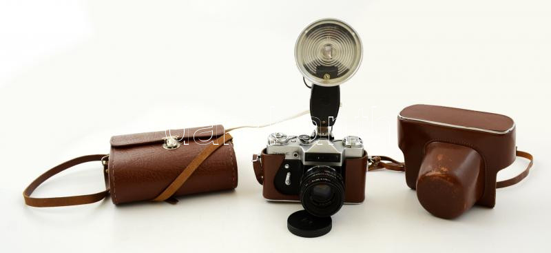 Beschreibung: Zenit E kamera Helio 44-2 2/58 objektívvel, hozzá hordozható vakuval. Mindkettő bőr tokban / Vintage Russian camera with portable flash