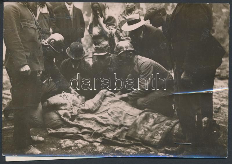 1913 Tűzvész után Pozsonyban. Tűzoltók és megmentett ember. Korabeli sajtófotó hozzátűzött leírással (kis szakadás) / 1914 Pressburg after large fire. Press photo with small tear 16x11 cm