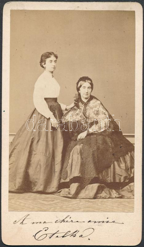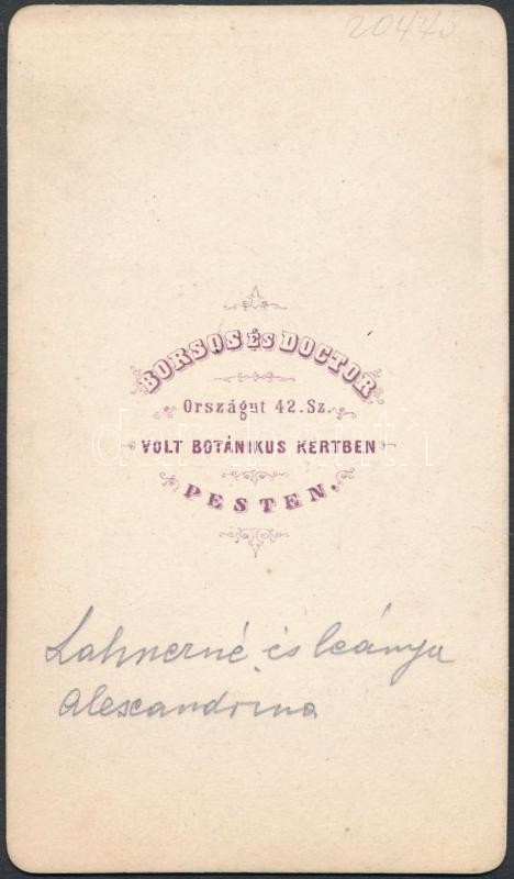 cca 1865 Lahnerné és leánya Alexandrina vizitkártya méretű, feliratozott fényképe, Borsos és Doctor pesti műterméből, a verebélyi Marzsó család fotó hagyatékából, 10,5x6,5 cm