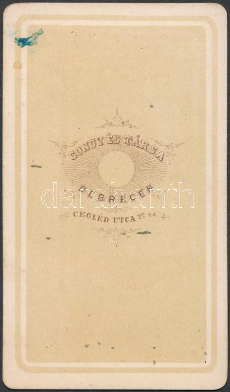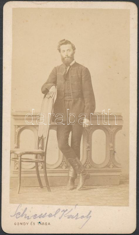 cca 1868 Schiessel Károly vizitkártya méretű, feliratozott fényképe, Gondy és Társa debreceni műterméből, a verebélyi Marzsó család fotó hagyatékából, 10,5x6,5 cm