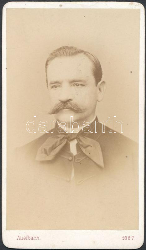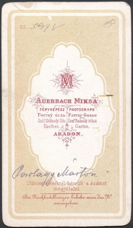 cca 1880 Posolagy Márton vizitkártya méretű, feliratozott fényképe Auerbach Miksa aradi műterméből, a verebélyi Marzsó család fotó hagyatékából, 10,5x6,5 cm