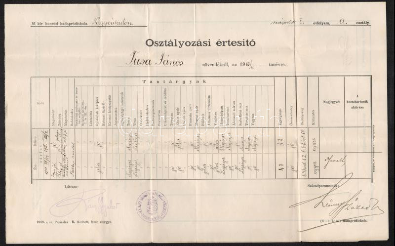 Beschreibung: 1911 a nagyváradi honvéd hadapródiskola osztályozási értesítője