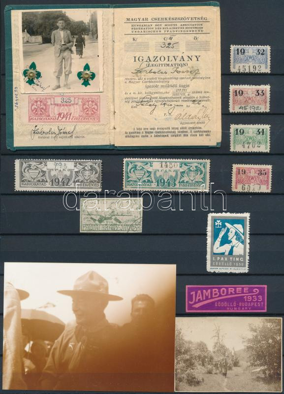 Beschreibung: 1932-1943 6 kl Cserkész igazolvány érvényesítő bélyeg + 3 klf levélzáró + 1 db Cserkész igazolvány 1941 + Baden Povel kép + menet