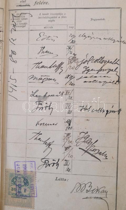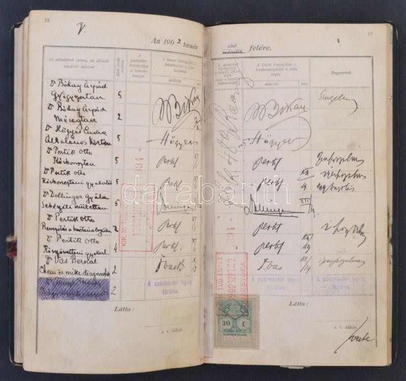 1900-1905 Halmi István Budapesti Királyi Magyar Tudomány-Egyetem izrealita vallású hallgatójának orvosi leckekönyve, az egyetem rektorainak (Rapaics Rajmund (1845-1909), Demkó György (1856-19140)), és dékánjainak (Bókay Árpád (1856-1919), Thanhoffer Lajos (1843-1909)) aláírásával, valamint számos neves tanár aláírásával pl: Eötvös Loránd (1848-1919), Than Károly (1834-1908), Bókay Árpád (1856-1919), Thanhoffer Lajos (1843-1909), Korányi Frigyes (1828-1913), Jendrassik Ernő (1858-1921), Lenhossék Mihály (1863-1937) és más neves tanárok, orvosok aláírásaival, okmánybélyegekkel, fotóval. viseltes állapotú borítóval.