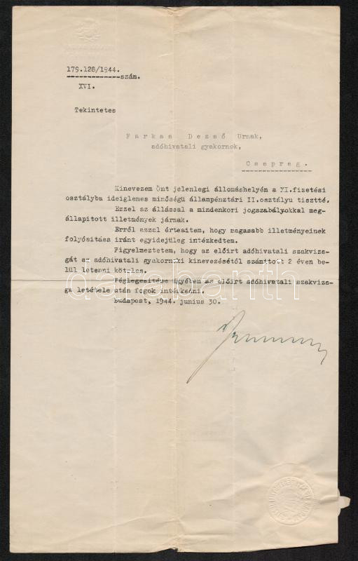1944 Reményi-Schneller Lajos pénzügyminiszter aláírása kinevezési okmá... https://www.darabanth.com/de/283-Fernauktion/283.0/Andere-Sammelgebiete/Signatur~19/1944-Remenyi-Schneller-Lajos-penzugyminiszter-alairasa-kinevezesi-okmanyon~II1470352