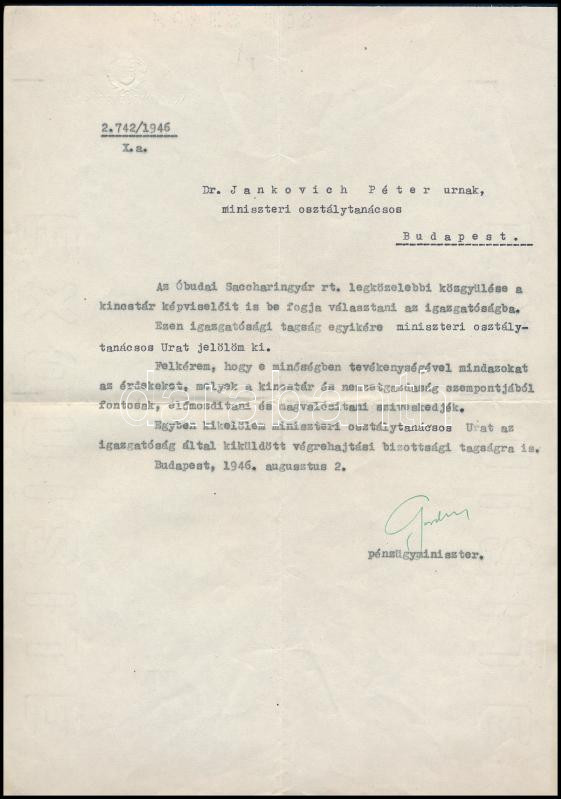 1946 Gordon Ferenc pénzügyminiszter aláírása kinevezési okiraton https://www.darabanth.com/de/283-Fernauktion/283.0/Andere-Sammelgebiete/Signatur~19/1946-Gordon-Ferenc-penzugyminiszter-alairasa-kinevezesi-okiraton~II1467977