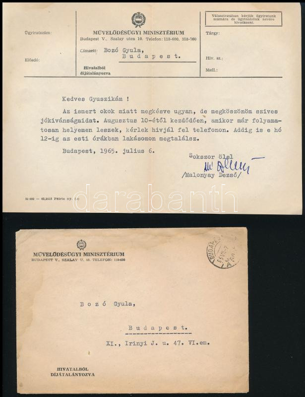 Malonyay Dezső Művelődési Minisztérium színházi főosztályának vezetőj... https://www.darabanth.com/de/283-Fernauktion/283.0/Andere-Sammelgebiete/Signatur~19/Malonyay-Dezso-Muvelodesi-Miniszterium-szinhazi-foosztalyanak-vezetoje-sziniigazgato-a~II1464989