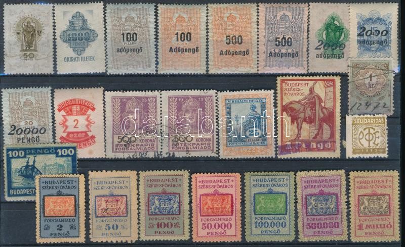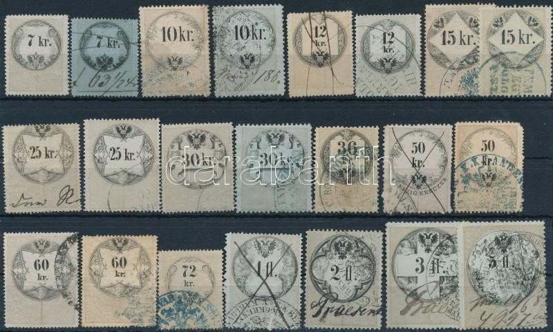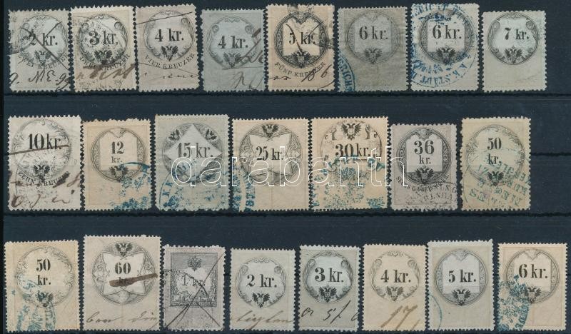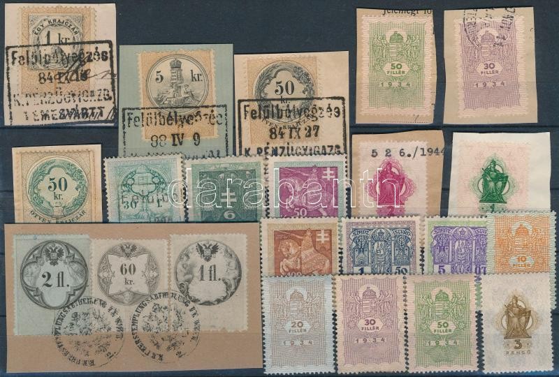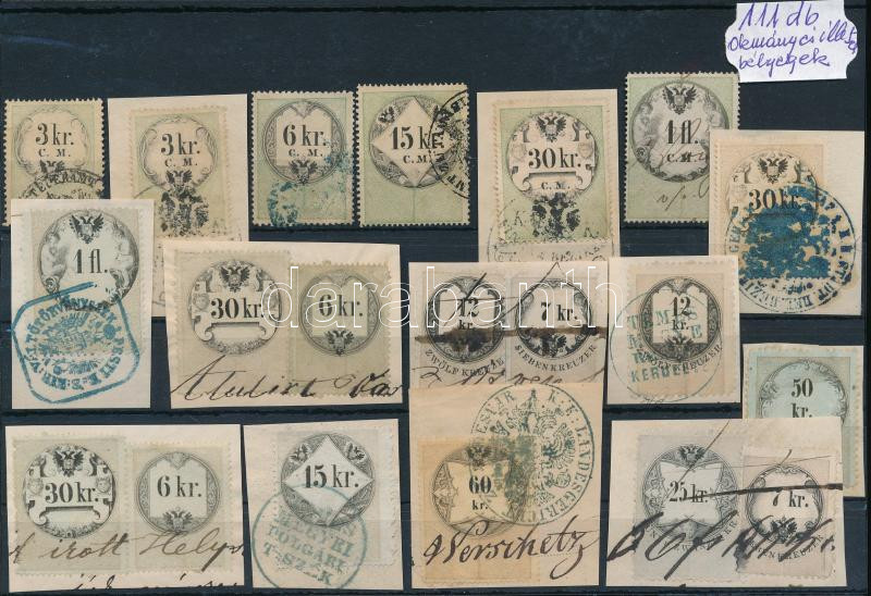 Beschreibung: 111 db régi okmánybélyeg 4 db stecklapon