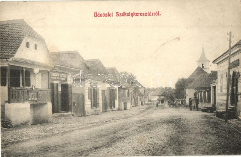 Székelykeresztúr, Cristuru Secuiesc; Templom utca, Könyvnyomda és könyvkötészet, gyógyszertár / Church Street, shops, pharmacy (kis szakadás / small tear)