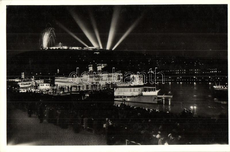 Beschreibung: 1938 Budapest, XXXIV. Nemzetközi Eucharisztikus Kongresszus, Esti hajófelvonulás a Dunán, tüzijáték (EK)