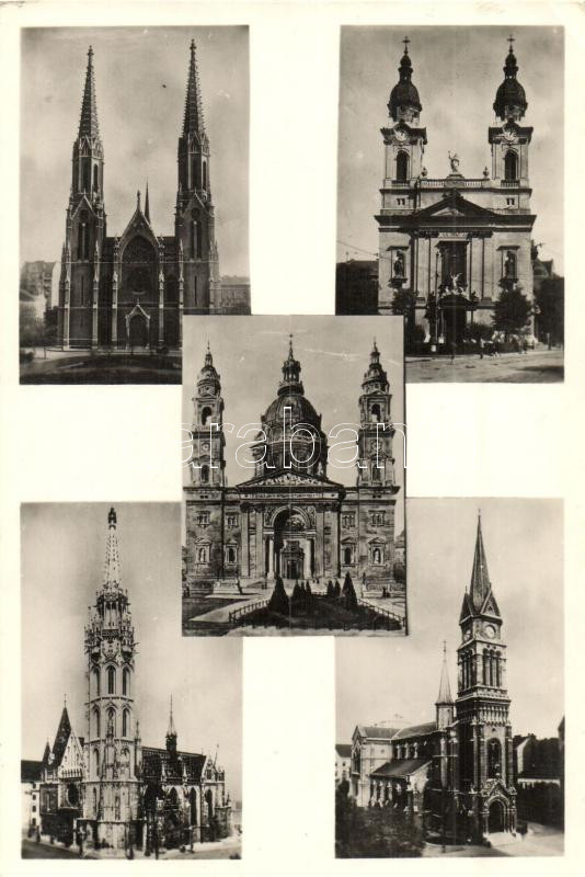 Budapest, templomok: Szent István bazilika főbejárata, Koronázó főtemplom, Józsefvárosi római katolikus templom, Bakáts-téri róm. kat. templom, Erzsébetvárosi róm. kat. templom, Gárdony és Fenyvesi kiadása (EK)