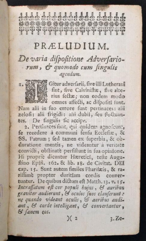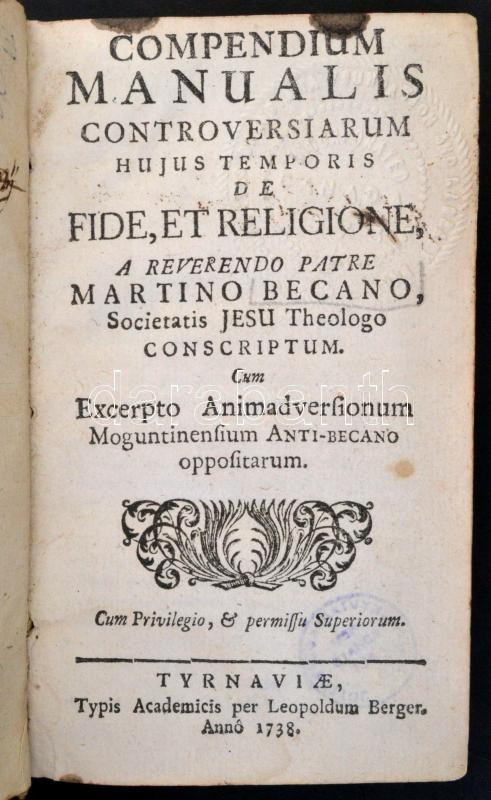 Martinus Becanus (1561-1624): Compendium manualis controversiarum hujus femporis de fide, et religione. Tyrnaviae (Nagyszombat), 1738, Leopold Berger, 12+458+10 p. Korabeli bőrkötés, megviselt állapotban, a bortítója kopottas, a gerince sérült, az elülső előzéklapon bejegyzések, szárazpecséttel, intézményi bélyegzővel, a kötése sérült, foltos lapélekkel, latin nyelven. Contemporary leather-binding, in poor condition, the cover is worn, the spine and binding damaged, with wrintings on the front shield page, with dry seal, with office seals, in Latin linguage.