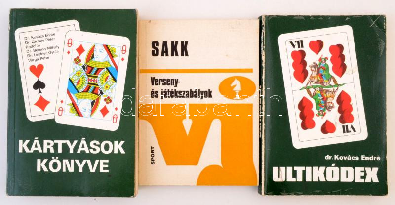 3 db játékkal kapcsolatos könyv: Kovács Endre: Ultikódex (1981); Kártyások könyve. Szerk.: Berend Mihály (1984); Sakk, verseny- és játékszabályok (1978). Papírkötésben, jó állapotban.