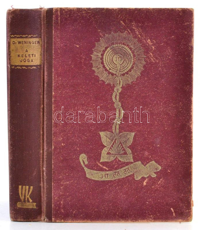Dr. Weninger Antal: A keleti jóga. India misztikája és ősi gyógymódja. Bp., 1943, Vörösváry. Második, lényegesen bővített és teljesen átdolgozott kiadás. Kiadói félvászon kötés, kopottas borítóval, megerősített, javított kötéssel, fekete-fehér fotókkal, és négy színes ábrával.