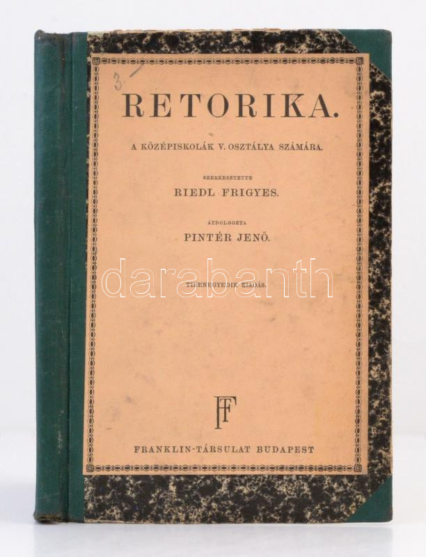 Retorika a középiskolák V. osztálya számára. Szerk.: Riedl Frigyes. Bp... https://www.darabanth.com/de/283-Fernauktion/283.0/Bucher/Bucher-Sonstige-Raritaten~500002/Retorika-a-kozepiskolak-V-osztalya-szamara-Szerk-Riedl-Frigyes-Bp-1933-Franklin-KesC5~II1468199