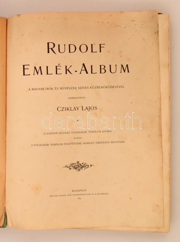 Rudolf emlék-album. A magyar irók és művészek szíves közreműködésével szerkesztette Cziklay Lajos. Budapest, 1897, Rigler József Ede Papírnemügyár Rt. ny., Kispesti Rudolf Fogadalmi Templom felépítésére alakult országos bizottság. Szövegközti és egészoldalas képekkel gazdagon illusztrált díszmű. Kiadói aranyozott félvászon kötés. Megviselt állapotban. A borítója és a gerince viseltes, a kötése sérült, pár lap kijár.