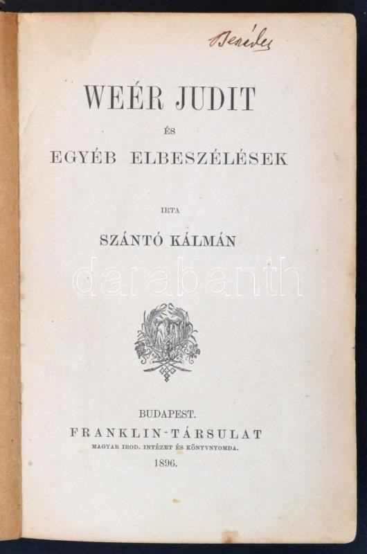 Szántó Kálmán: Weér Judit és egyéb elbeszélések. Bp., 1896, Franklin-Társulat. Kiadói egészvászon kötés, kissé viseltes állapotban, kopottas, foltos borítóval, laza fűzéssel, pár lap foltos.