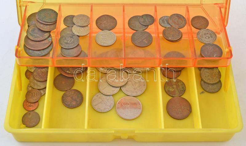 Beschreibung: 68db-os vegyes magyar és külföldi fémpénz tétel, műanyag horgászdobozban, közte 1851G 2kr Cu; 1938. 50f Cu-Ni; Svájc 1925B 1r Br, közte még krajcárok és alumÃnium pengÅ‘k is nagyobb számban T:vegyes