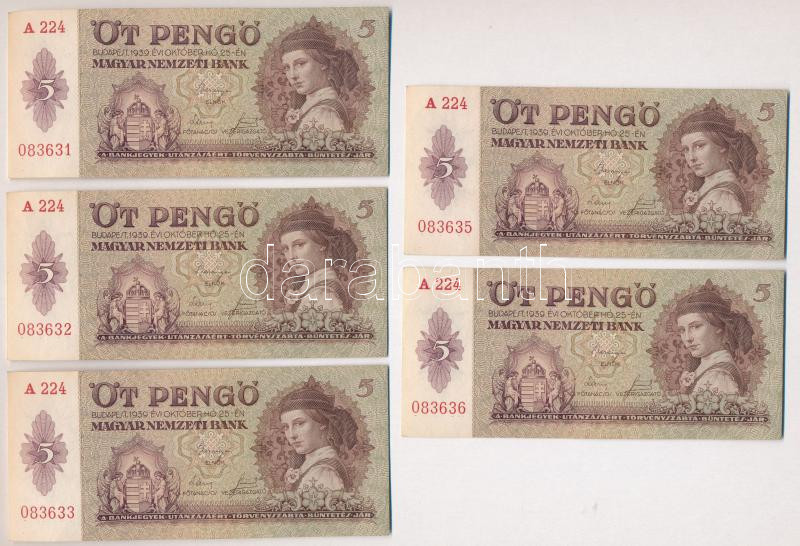 Beschreibung: 1939. 5P (5x) sorszámkövetők (3+2) T:I-