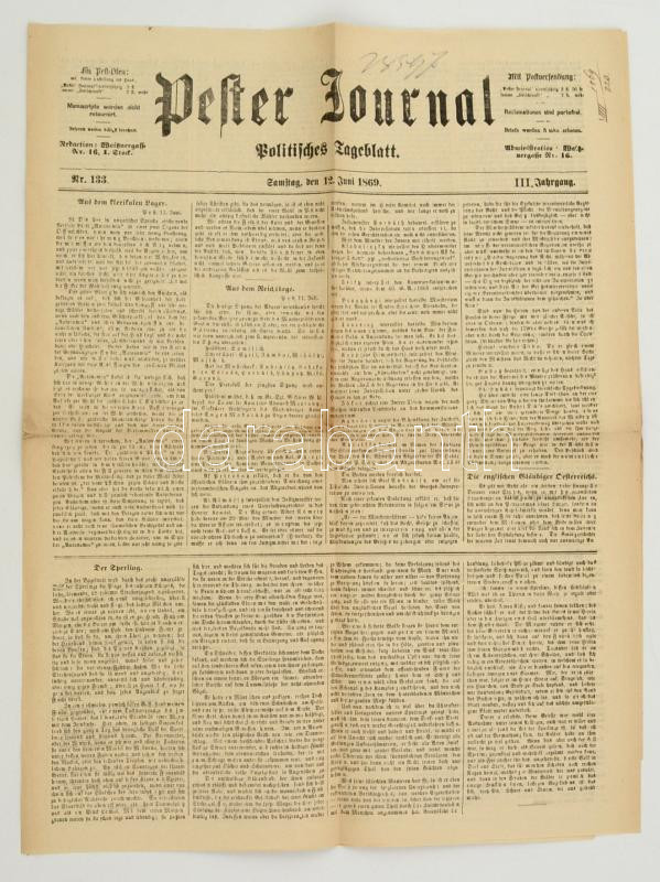 1869 Pester Journal, Politisches Tageblatt III. Jahrgang Nr. 133., 4p https://www.darabanth.com/de/284-Fernauktion/284.0/Andere-Sammelgebiete/Drucksachen~27/1869-Pester-Journal-Politisches-Tageblatt-III-Jahrgang-Nr-133-4p~II1474807