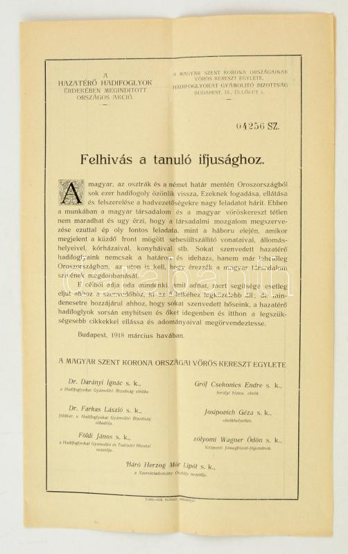 1918 Bp., A Vöröskereszt felhívás a tanuló ifjúsághoz a hazatérő hadif... https://www.darabanth.com/de/284-Fernauktion/284.0/Andere-Sammelgebiete/Drucksachen~27/1918-Bp-A-Voroskereszt-felhivas-a-tanulo-ifjusaghoz-a-hazatero-hadifoglyok-erdekeben-me~II1474586