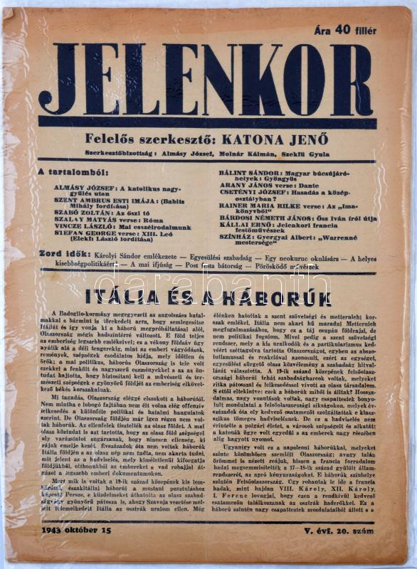 1943 Jelenkor, V. évf. 20 szám, Szerk.: Katona Jenő, papírkötésben, ki... https://www.darabanth.com/de/284-Fernauktion/284.0/Andere-Sammelgebiete/Drucksachen~27/1943-Jelenkor-V-evf-20-szam-Szerk-Katona-Jeno-papirkotesben-kisse-szakadt-allapotban~II1480289