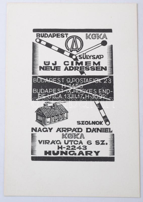 Nagy Árpád Dániel (1922-1985): Új címen, fametszet, papír, 14x10 cm. https://www.darabanth.com/de/284-Fernauktion/284.0/Andere-Sammelgebiete/Ex-libris-Kleingrafik~2/Nagy-Arpad-Daniel-1922-1985-Uj-cimen-fametszet-papir-14x10-cm~II1478955